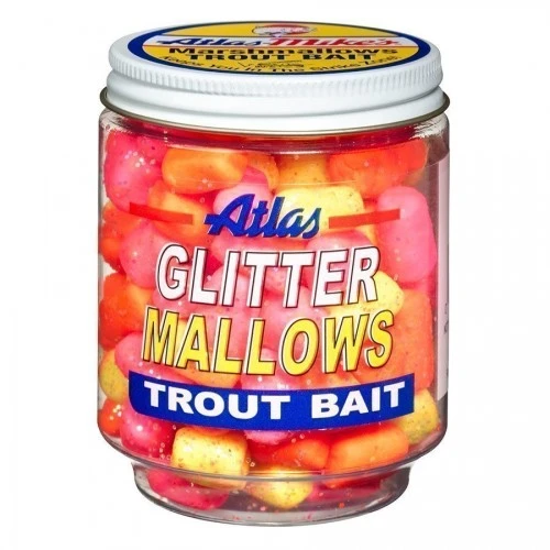 - Atlas Glitter Mallows are a scented marshmallow trout bait.