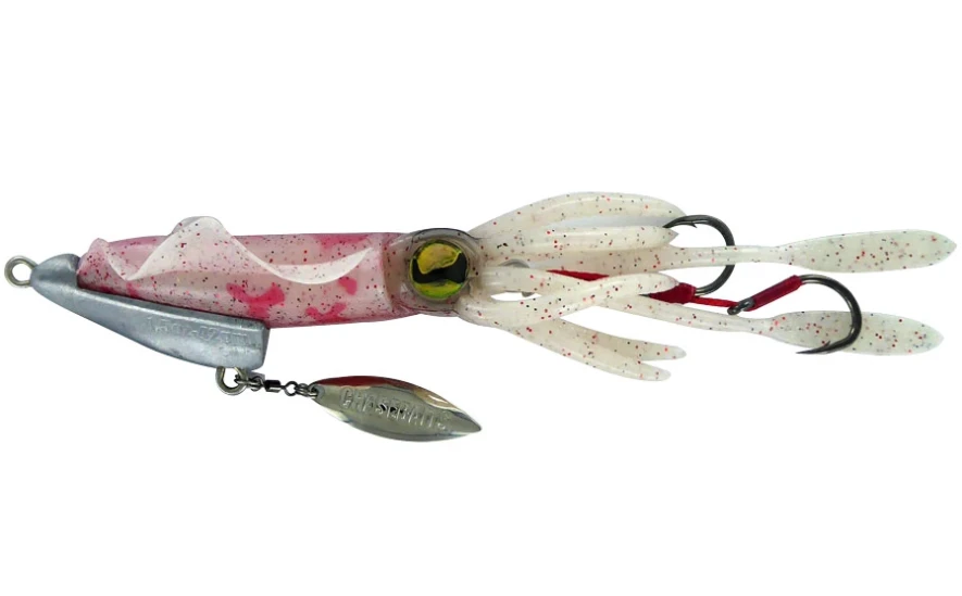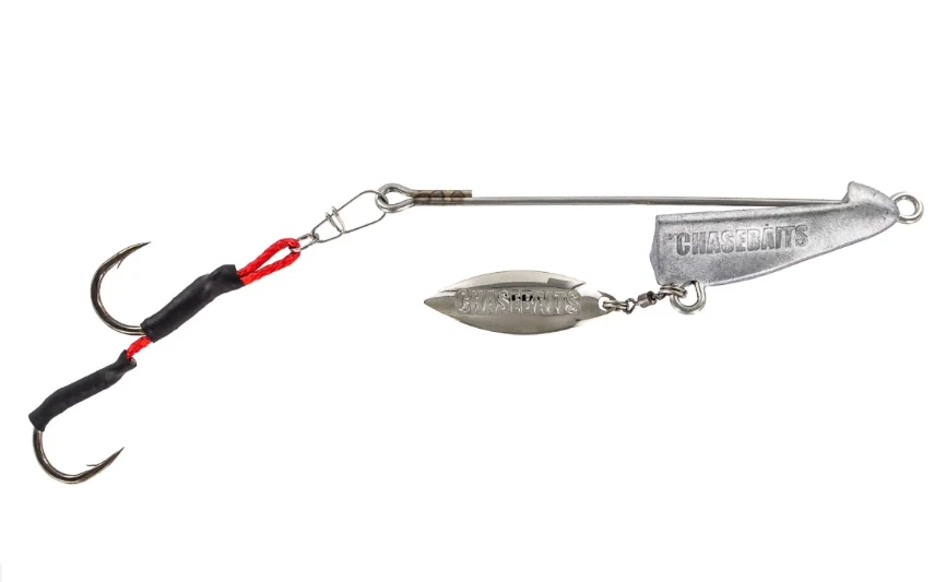 The Chasebaits Squid Rig is a rigging system for the Chasebaits The Ultimate Squid. Available in a range of sizes to match the different sizes of The Ultimate Squid, all include the molded weight jig head, strong and sharp 4/0 twin assist hooks, and a custom Willow blade. Designed to sink at the perfect angle for impeccable hood wing movement and balanced action. The twin assist hooks are attached to the rig with a quick-release clip rated to 85 pounds, and the included flash blade can be replaced with a treble, stinger hook, or any other required accessory.