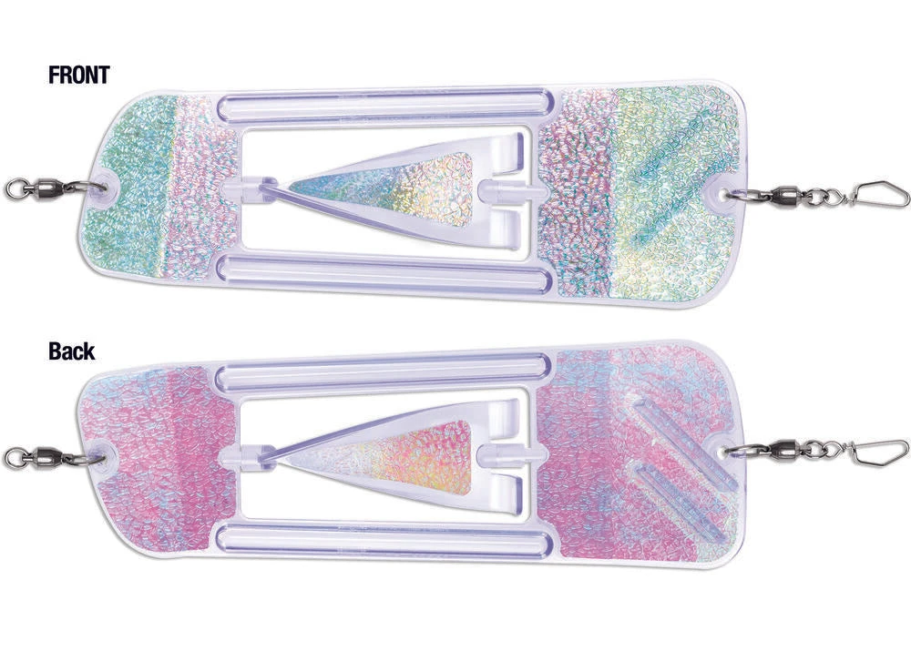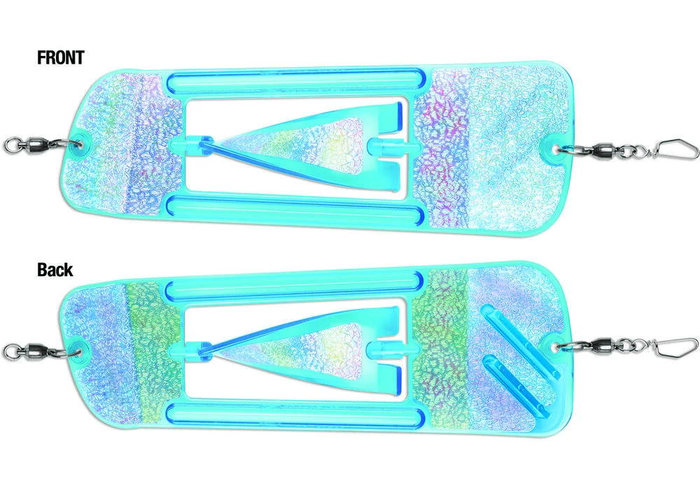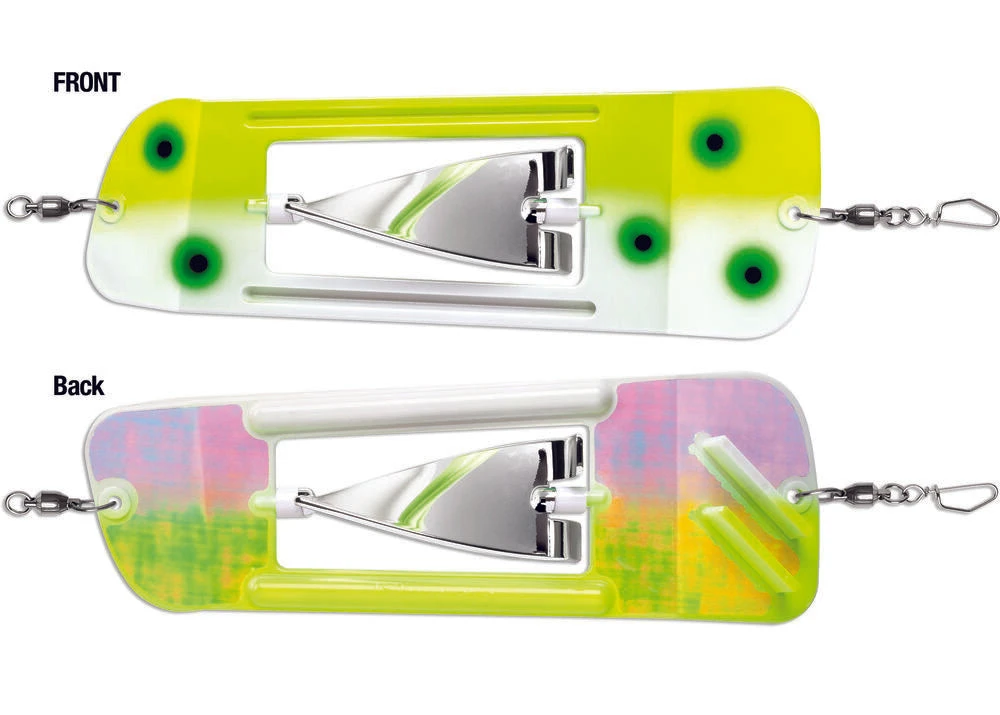 The Luhr-Jensen Coyote Cyclone Flasher is a new version of the Coyote Flasher with a rotating blade in the center. This easy pulling, fully rotating flasher rolls in a wide elliptical pattern, imparting fish attracting flash and motion to your trolling spread. The center “Cyclone” blade rotates independently adding a strobing flash and vibration. The Kick-Fin design keeps the flasher rolling over at virtually any trolling speed.