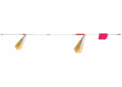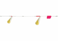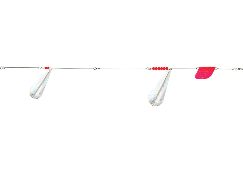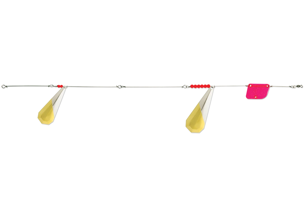 The Luhr-Jensen Model A Ford Fender is a 22 inch lake trolling rig with one size 9 top blade, one size 8 bottom blade, and a trolling rudder. Originally fashioned in the 1930’s from the headlight reflector of a Model A Ford, few fishing products in the world have as long as respectable a history as the Ford Fender Lake Troll. Trolled at slow speeds, the Ford Fender produces maximum flash and vibration that draws fish from extremely long distances.