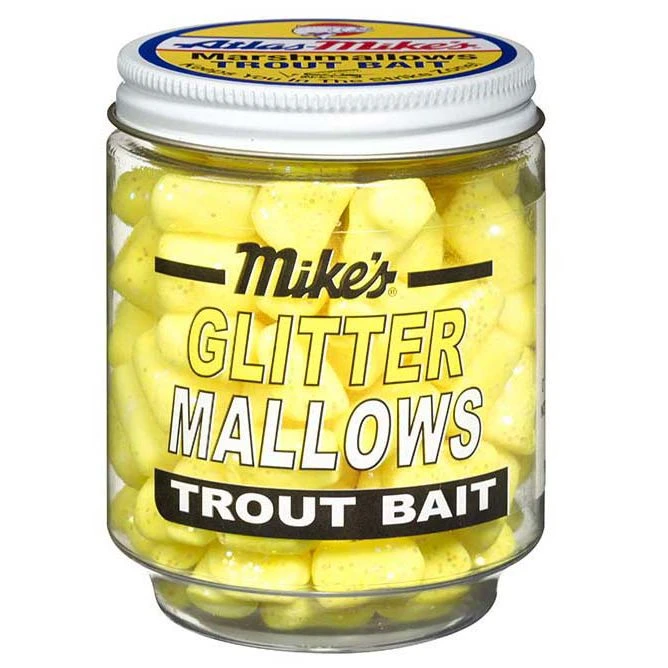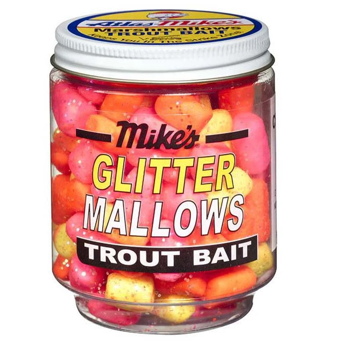 - Mike’s Glitter Mallows are a scented marshmallow trout bait.