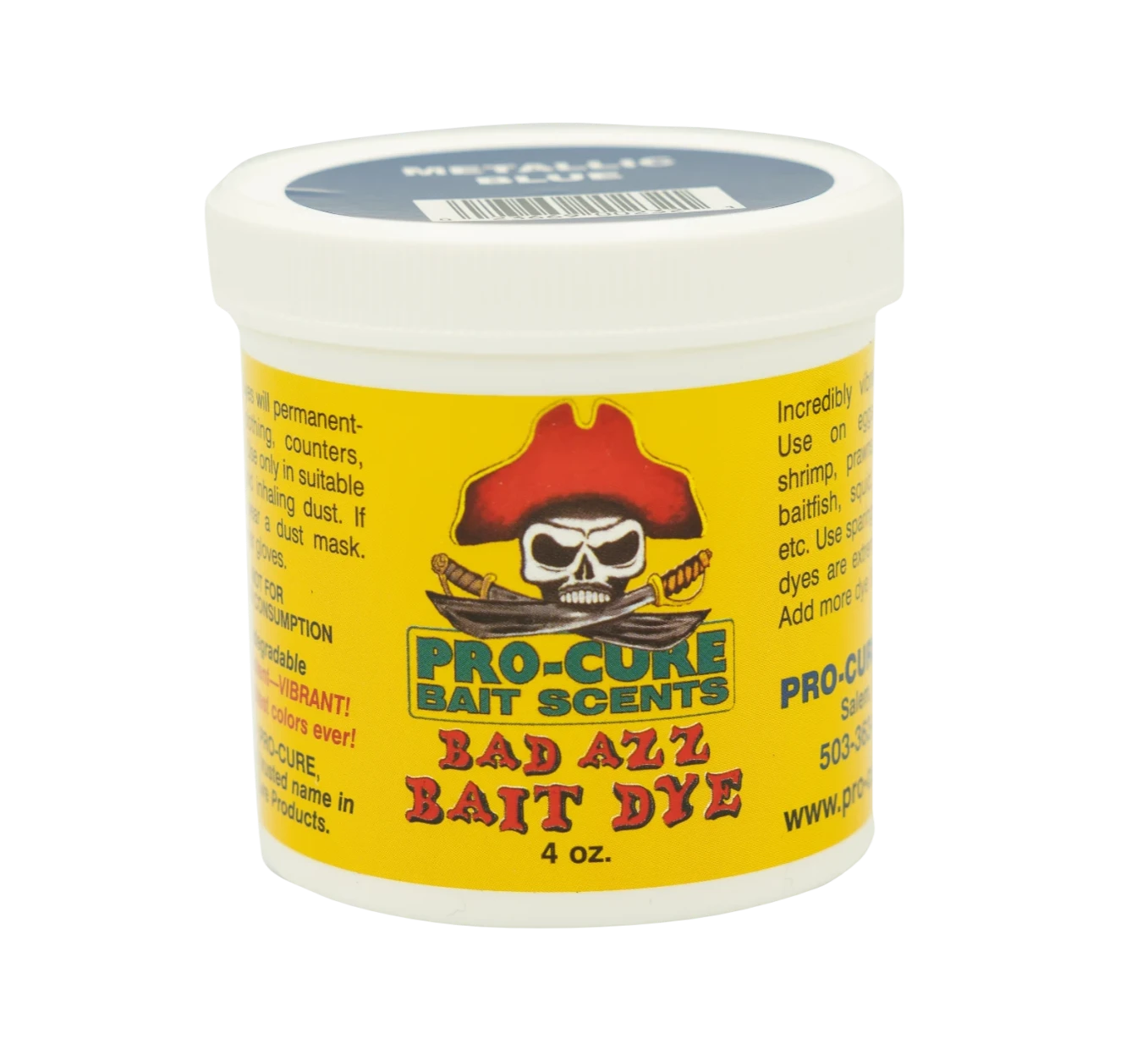 Pro-Cure Bad Azz Bait Dye is highly-concentrated bait dye. The perfect dye for big jobs. Whether you’re dyeing a few dozen herring, ballyhoo, or 10 pounds of prawns, this is the way to go. Pure concentrated bait dyes go along way in dyeing large quantities of bait. 4 ounce re-usable container. Available in 5 color options.