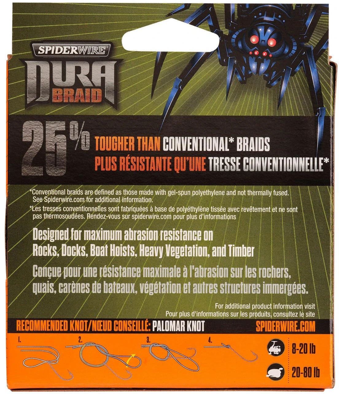 - Designed for maximum abrasion resistance on rocks, docks, boat hoists, heavy vegetation and timber, the Spiderwire DuraBraid line holds up to the abuse of fishing structure and cover.